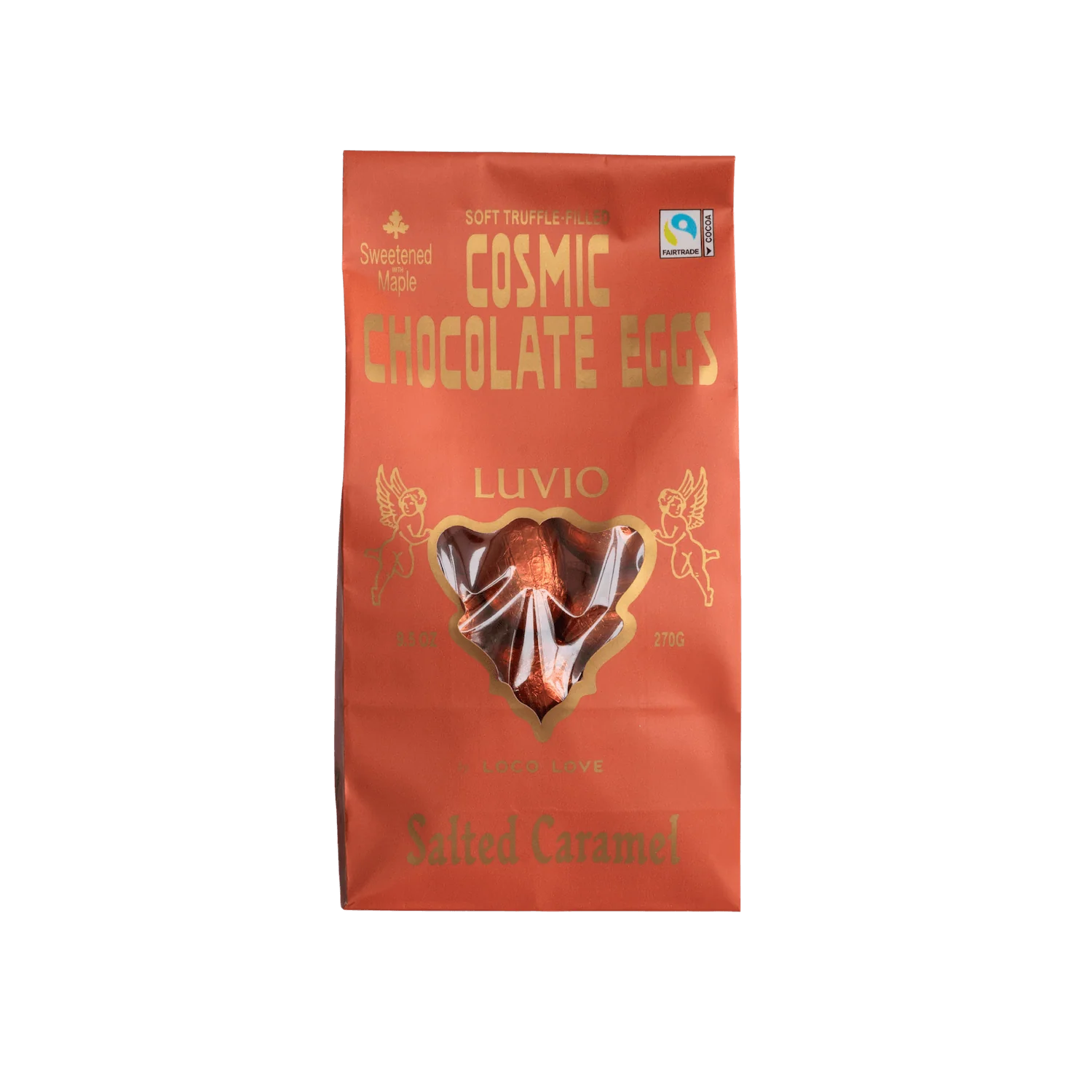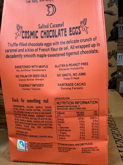 Filling (maple sugar (11.3%), inulin, cocoa butter, coconut oil, caramel granulate (5%) (cane sugar, glucose syrup, water), tigernut flour (2%), soy lecithin, sea salt (fleur de sel) (0.3%), vanilla bean), chocolate (cocoa mass, maple sugar (16.8%), cocoa butter, tigernut flour (5%), soy lecithin). [Cacao solids 55%]. Contains: Soy May be present: Hazelnut, Almond, Milk